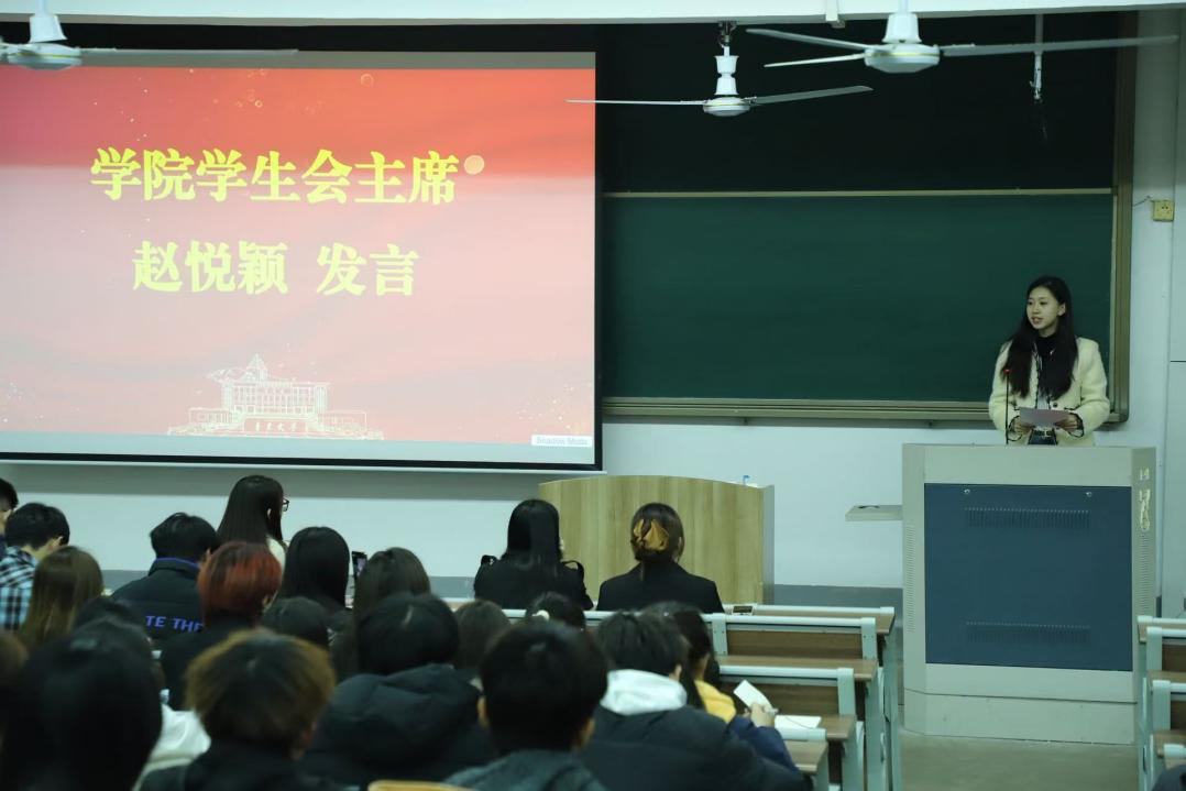 学生会主席赵悦颖上台发言,她首先通过抛出“何为学生干部?如何成为一名优秀的团学组织志愿者?”两个问题引发台下思考,号召全体成员积极践行全心全意为同学服务的根本宗旨,并提出应做到的“六个意识”“六点能力”。