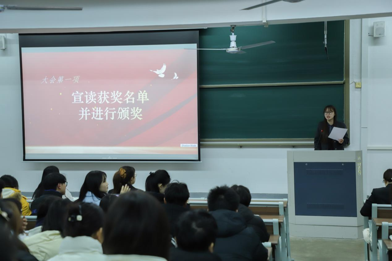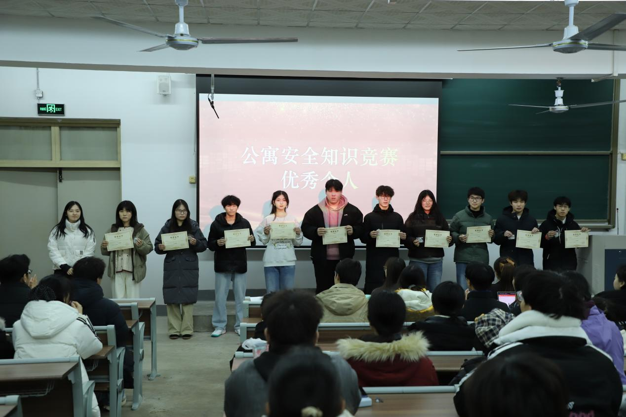 大会伊始,主持人介绍会议主旨与流程。随后进入表彰环节,学院学生事务办公室主任王静瑶宣读“新生大比武优秀宿舍”“公寓安全知识竞赛优秀个人”等获奖名单,学院团委副书记王温馨、辅导员高原为获奖代表颁奖,获奖代表登台领奖树立先进榜样;优秀舍长代表分享宿舍管理与内务整理经验,助力优秀做法推广;安全宣讲通过违禁品展示、宿舍案例对比及管理细则解读,筑牢安全防线、明确管理规范。