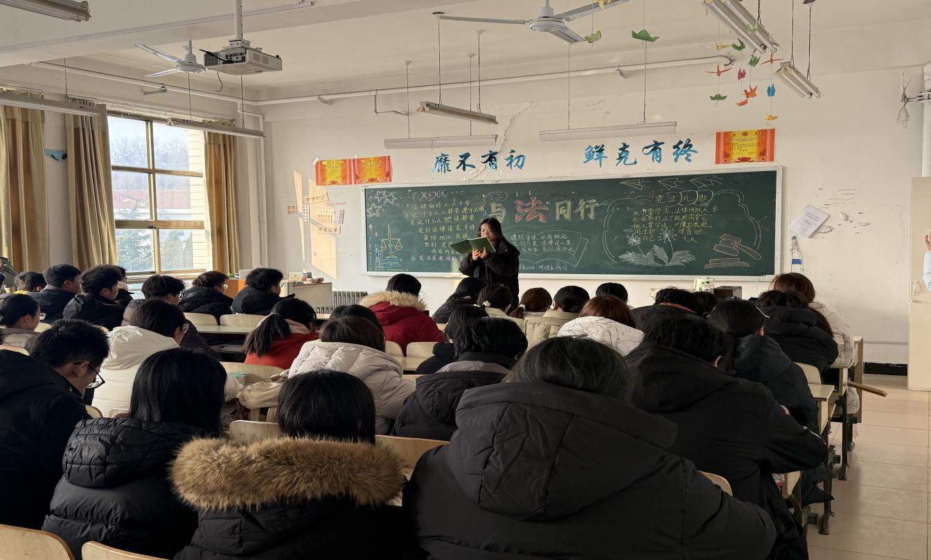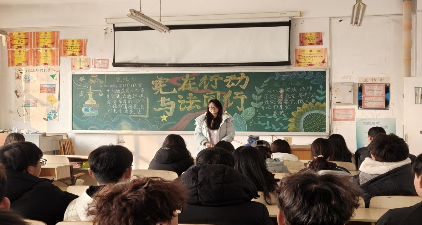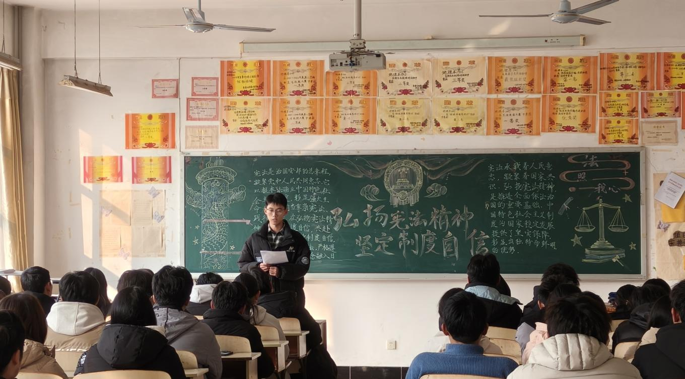 活动在各班自习室同步进行。伴随着主题板报营造出的庄重氛围,“宪法故事汇”环节率先展开。同学们走上讲台,分享了亲身参与社区普法、见证家乡依据宪法精神推进环境治理等真实故事。这些源于生活的讲述,将抽象的宪法条文与鲜活的实践相连,引发了同学们对宪法核心要义与我国制度优势的热烈讨论。