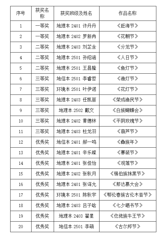 为挖掘中国小众节日的趣味内核与文化价值,我院于11月10日成功举办以“日历‘奇葩图鉴’--小众节日分享”为主题的“资环小邮箱”活动。本次活动自从举办以来,得到了同学们的积极响应与广泛参与。经过激烈角逐,共评选出一等奖2名、二等奖3名、三等奖6名以及优秀奖9名。获奖名单公示如下: