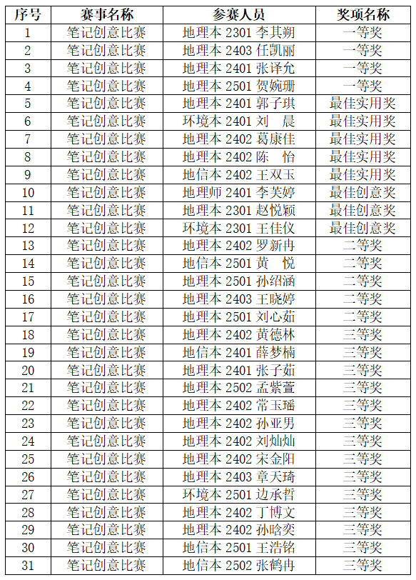 我院于近日成功举办“学思创智”——笔记创意比赛。本次活动受到各年级同学的积极响应,涌现出一批内容扎实、形式新颖、富有思考的优秀笔记作品。经评审委员会严格评审,最终评选出一等奖4名、二等奖5名、三等奖14名以及最佳实用奖5名、最佳创意奖3名。现将获奖名单公示如下: